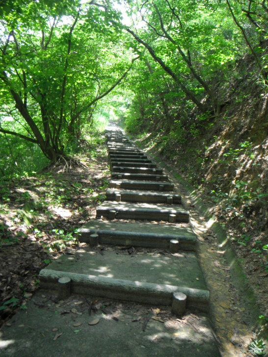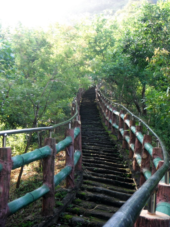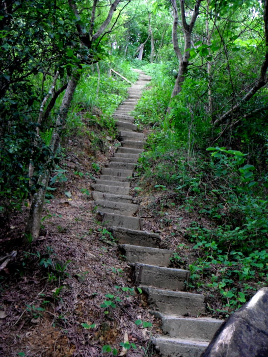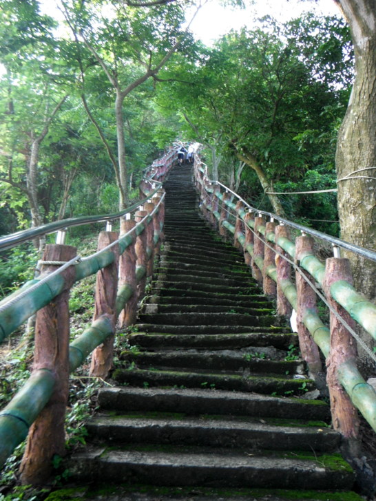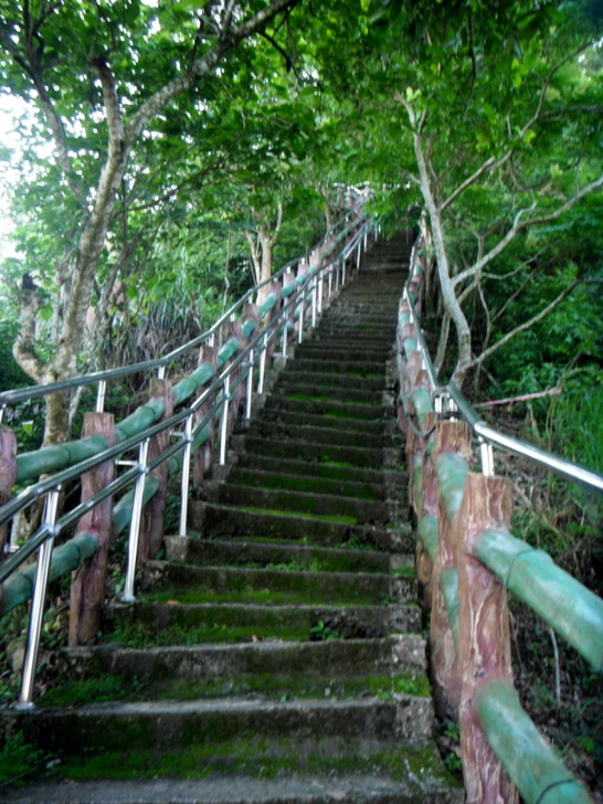 取道石階陡上。看不到終點的石階路,雖完善卻頗陡,有些民眾停下小休,路ㄟ緩步代休,慢慢上行,不消片刻,一樣汗流夾背,這段石階走來不稍遜於汐止大尖,更有過之的感覺。