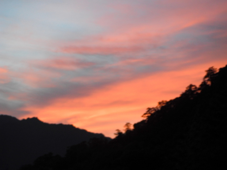 清晨晨曦染紅了基那吉山頭,朋友們也都起床梳洗整裝,路ㄟ仍舊是簡單行裝,照慣例泡咖啡當早餐。用畢早餐,部份朋友今天選擇進新光部落悠閒打混,只有十七位朋友造訪毒龍潭。