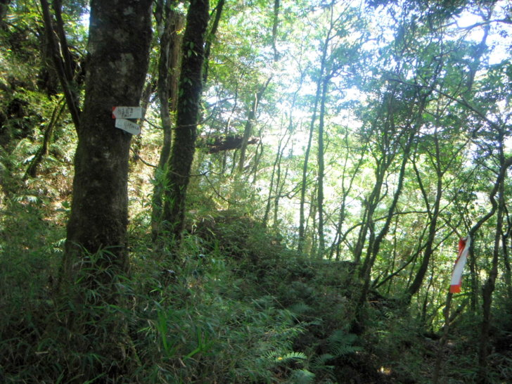 ↑就是在這裡!顧著賞美麗的神木,笨路ㄟ竟忘了要取右陡上,被某山社的布條誤導,順著布條走,直到走到毒龍潭上方,看到湖在下面,才驚覺走錯路,循著獵徑,開GPS指引,找路下切,多折騰了一個多小時,對於隊友們有著深深的歉意!