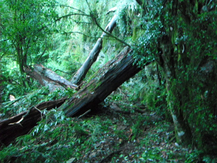 0727過5k樁(H2655m)。颱風過後的小災情,迂迴繞過小倒木,林道中沒有太陽荼毒,濕透的雨鞋卻是走來不太舒服。