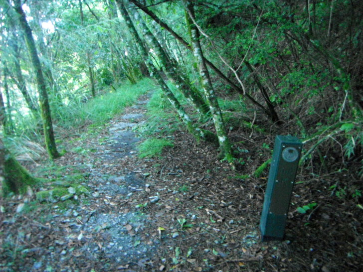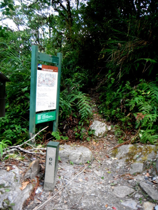 1452慈恩0k登山口。入山、入園證註明"已下山"後,投入登山口旁的信箱裡。原本明隧道旁的新闢登山口步道已被颱風沖壞,不太好走,路ㄟ拉繩下溪谷後,再渡溪攀登回公路。