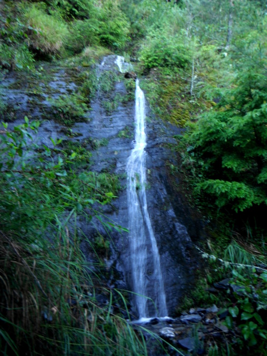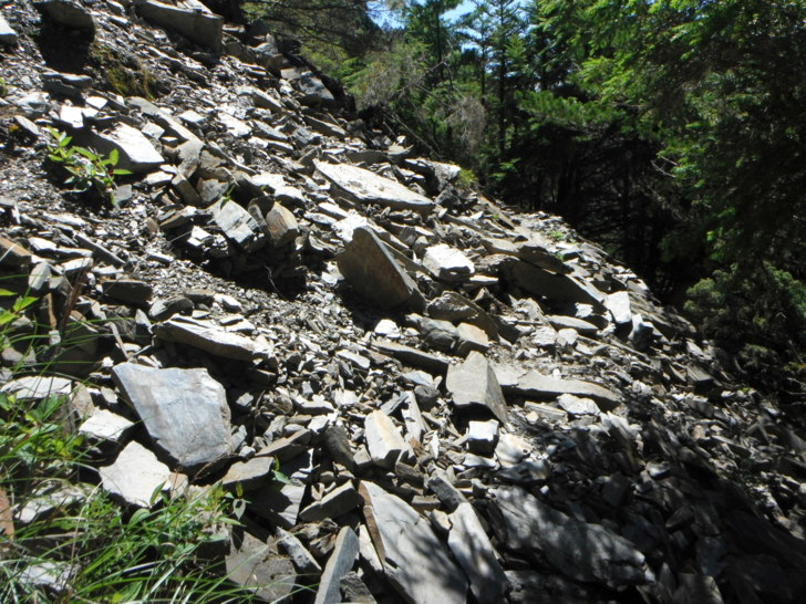 0701過崩坍地(H2620m)。較大面積的崩塌地型,土質踏實,走來安全,反而有不錯的展望可賞。過了崩坍地後,迎面而來的是一個不小且優美的瀑布,記憶中,這段路沒有這個瀑布,應該是大雨造成水量豐沛的結果吧!穿越瀑布下而過,錯估水深的路ㄟ懶得踩樹根渡過,結果水深及膝,雨鞋進水,弄得路ㄟ哭笑不得,停下倒水時,一位獨行女山友,輕裝超越,應該是當攻畢錄,路ㄟ來不及打招呼,已消失在林道中,好快的腳程,路ㄟ自嘆不如!