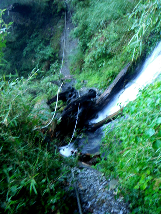 下到瀑布底層後,無繩可拉,水量頗大,尋找適切踩點,以登山杖確保穿越瀑布後,拉繩陡上。陡上路感覺比下切好走且安全許多。
