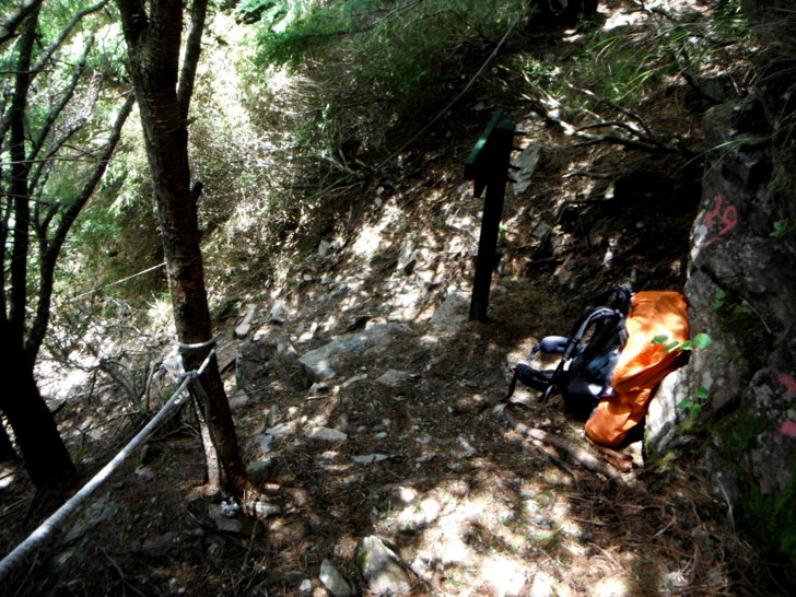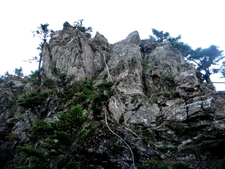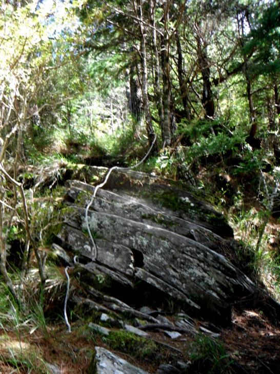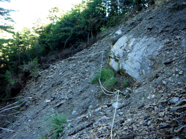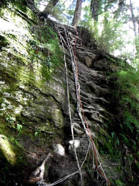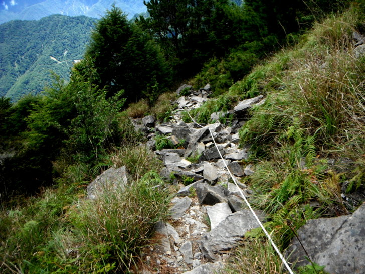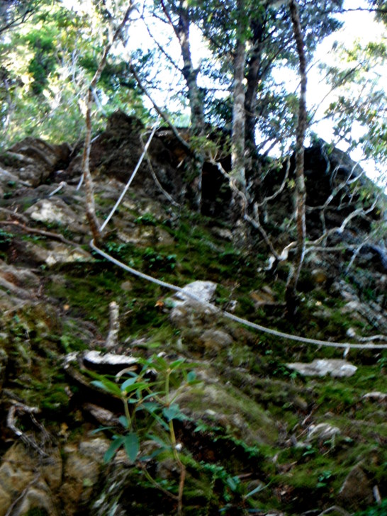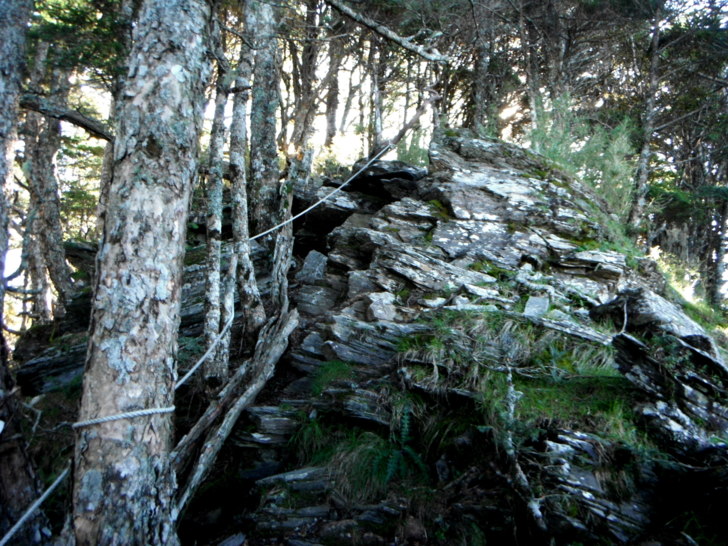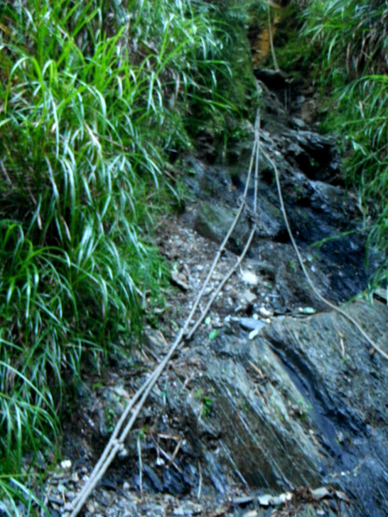 1000出發續行。準備過溪時,見有山友下來取水,應該是早上碰到的山隊吧!取道登山口開始陡上。一路防迷繩相隨,在這陡坡中,借繩使力,減輕疲累感,卻也減緩了行進速度。對於這段路,路ㄟ知道不好惹,緩步代休上行方式,才是最穩定的走法。