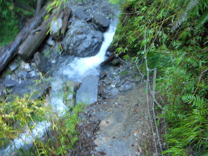 0851過8k(H2610m)。從這裡開始接觸第二段困難地型。追加颱風過後的倒木之後,拉繩陡下溪谷。路程雖不長,不太明顯的踩點,被水花噴濺的石壁,還是小心慢下。