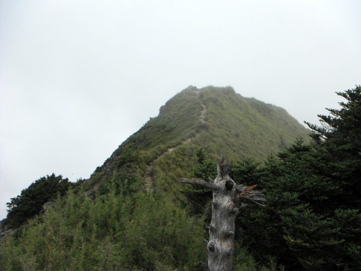1200過木梯(H3060m)後又是一陣陡上。途中遇早上超越路ㄟ的美麗女山友,已登頂下山(好快的速度),停下閒聊片刻。她表示山上還有兩位當攻山友,其中一位狀況並不理想,輕裝想縱走羊頭下山,理由竟是由羊頭下山里程數較短,她建議路ㄟ山上碰到他們時,請他們不要冒險,還是原路下山較安全。真是貼心的漂亮山友,互道珍重後,分道續行。
