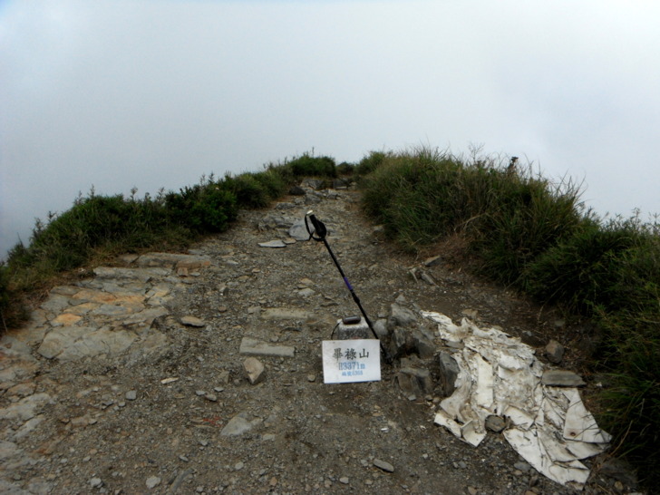 1335登頂畢錄山(H3360m,記:3371m)。雲霧遮蔽了大部分的展望,偶透的展望稍縱即逝,路ㄟ來不及按下快門。拍完登頂照後,期待撥雲見景,卻是看見雲層越來越濃,也越來越黑,夏季午後雨本就是常態,再等下去,似乎不太聰明。