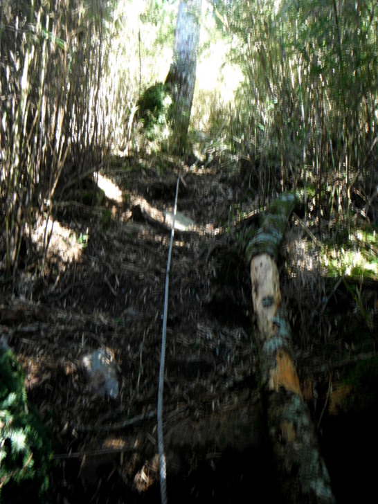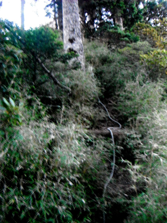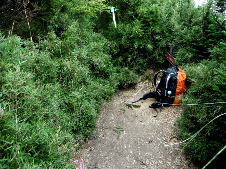 0751小營地(H3050m)。發現路ㄟ的相機不見了!最後拍照點是在鋸東營地,莫不是掉在那裡,兩天來的記錄照片都在裡面,這可非同小可,卸下背包,折回尋找,在離鋸東不遠的箭竹林徑上,發現相機吊繩掛在箭竹上,趕緊取回收好,真的是好裡加在!