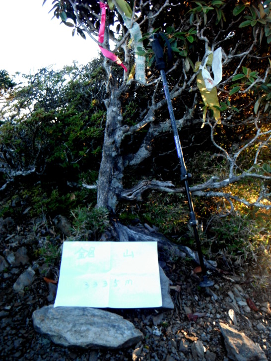 0532登頂鋸山(H3355m,記:3350m)。沒有基點的山頭,沒有山社留下的高度牌,只有一塊字跡已非常模糊的石板,路ㄟ沒有準備高度紙,只好用帶來的白紙寫上山名拍基點照。