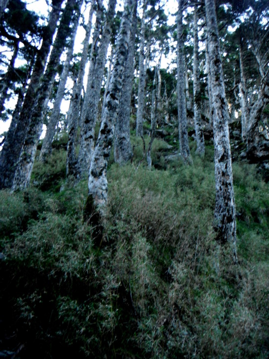 0729鋸東營地(H3165m)。上下兩層的營地,一組登山團隊紮營不成問題。只是要從畢錄水源地揹水到這裡,可不是一件輕鬆的事,重裝縱走畢羊還是有一定的難度存在的。續行,又開始鑽密不透風的箭竹海,感覺像在走雪山西稜。