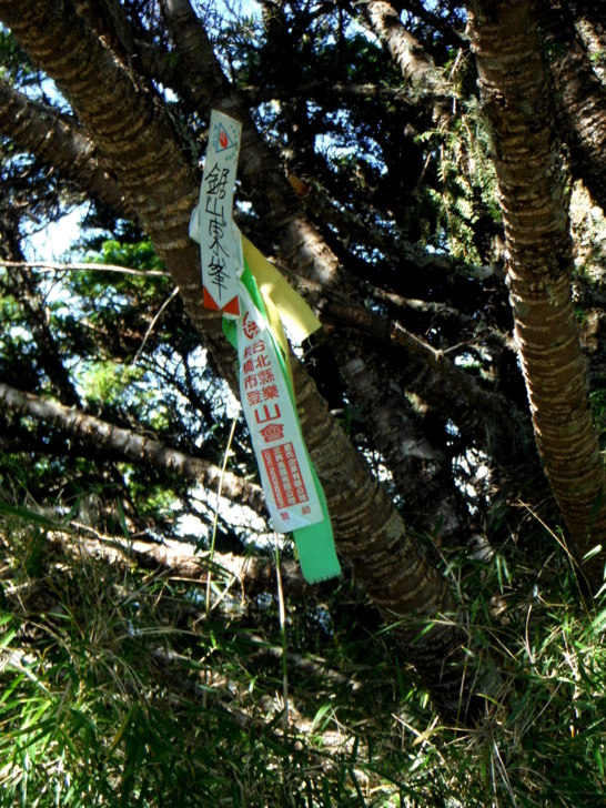 0909鋸山東峰(H3080m)。山社在杜鵑木上掛個牌子註明,一樣是無基點山頭。感覺第八峰的景色比這裡優很多。走到這裡也等於已經翻越過鋸山連峰,要開始進入羊頭山的範圍。
