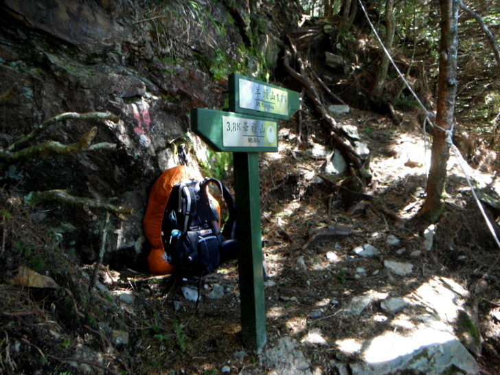 1325登稜三叉路(H3345m)。指標橫躺在小徑上。右往羊頭,左往畢錄。下重裝,喘口氣,喝口水。
