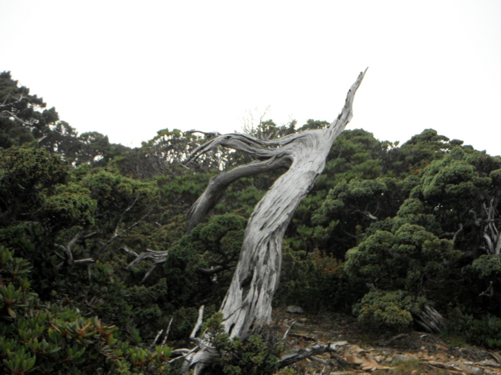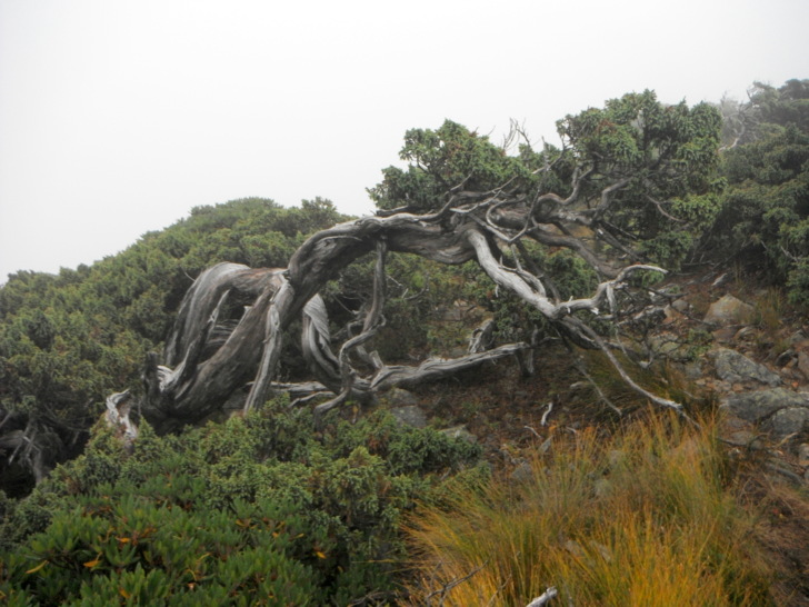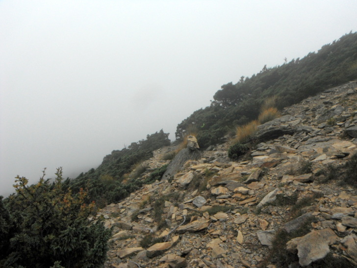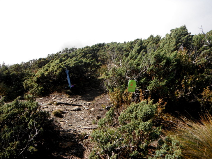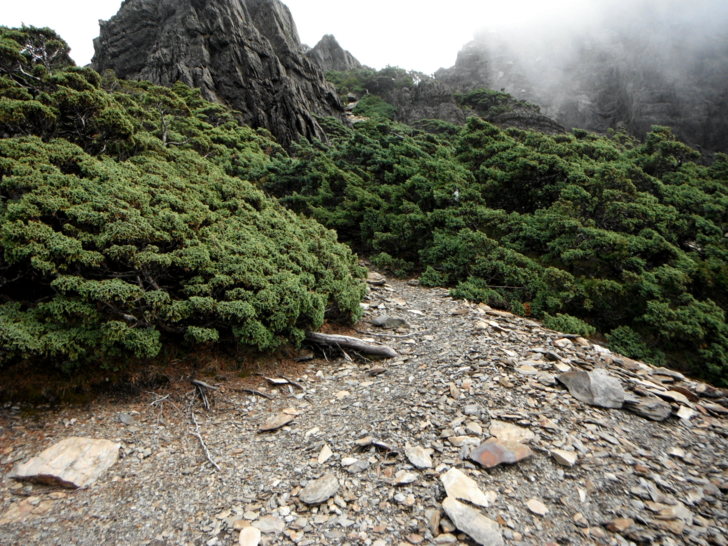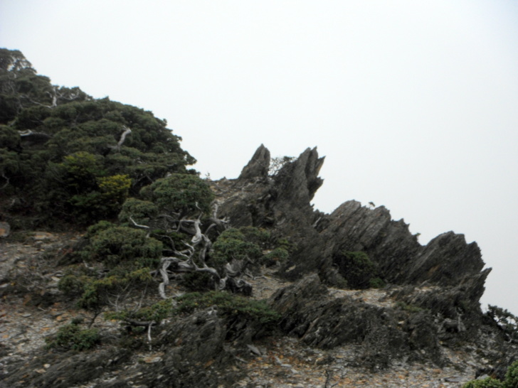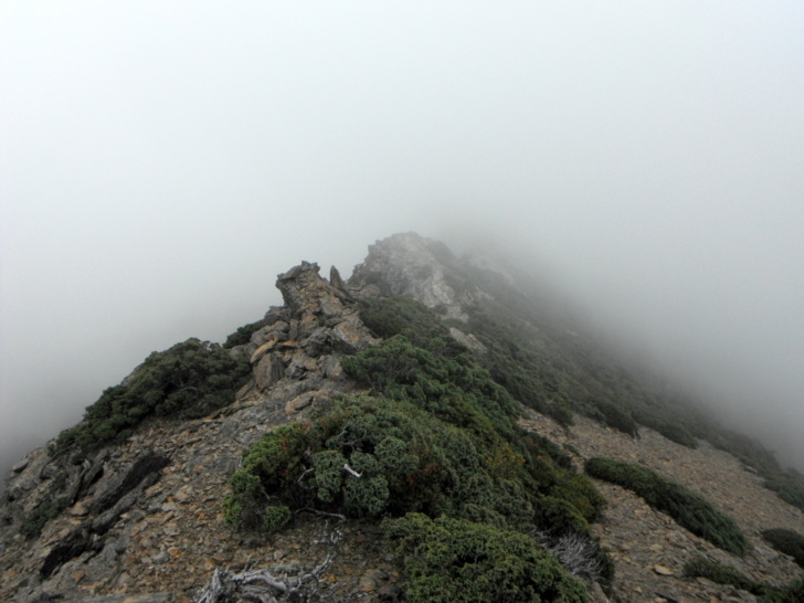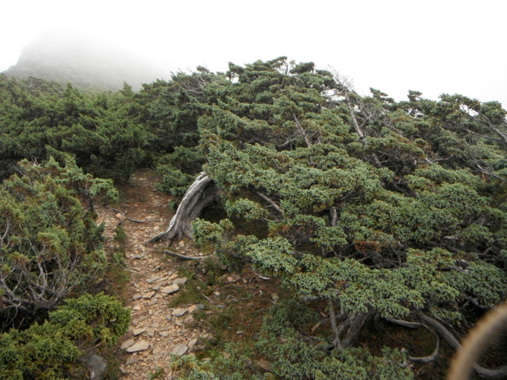 1106回抵四叉路口。已不敢再打混摸魚,順東小南指標行。順稜起伏,高差不大,走來輕鬆。兩旁有圓柏相伴,稜線上已濃霧臨身,雖有身形優美的圓柏,也無心欣賞,一路快行。
