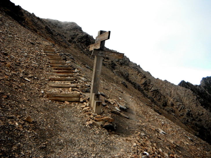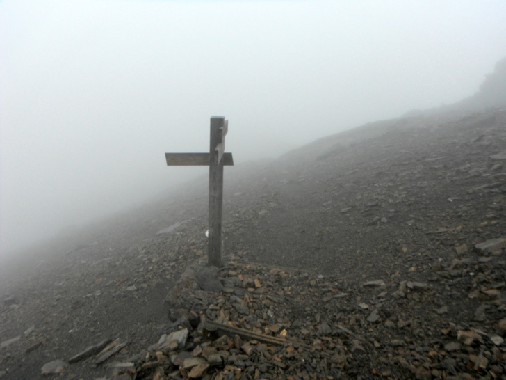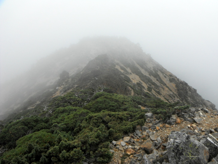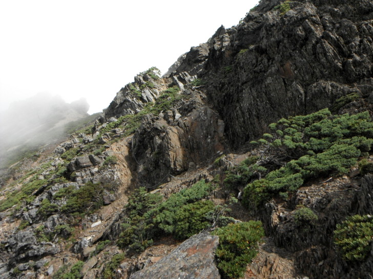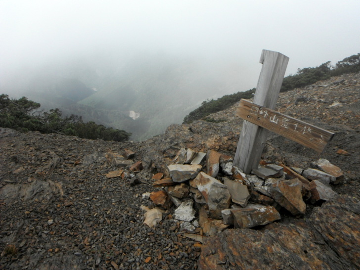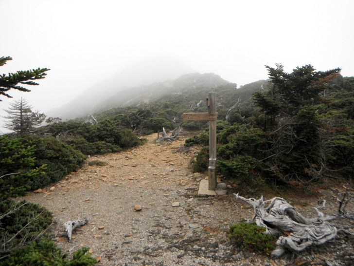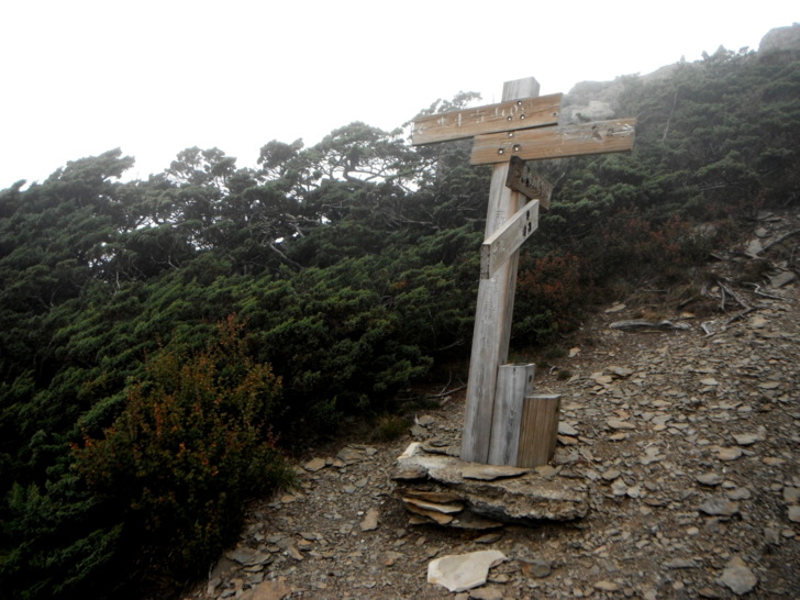 0920指標牌越嶺點(H3790M)。原本這裡有不錯的展望,如今已被霧遮,這裡也算是三叉峰登山口。路ㄟ雖然腳癢,想上三叉峰,在天氣的轉變下,也不敢造次,風勢逐漸增強,不宜久留,續行腰繞,曝露感頗大的小徑,在風勢加持下,只能更加小心慢行。