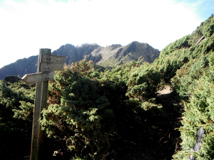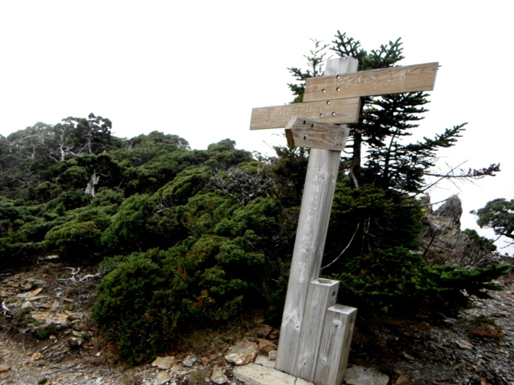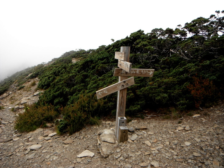 0948四叉路口(H3765M)。指標"直往鹿山,右往東小南0.9K,左往南峰0.2K"。取左行。飛昇快速的雲層,已看不到藍天,路ㄟ暗自祈禱,給路ㄟ30分鐘的好天氣就好,別讓南峰展望消失!