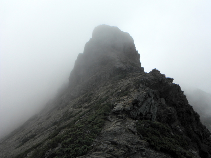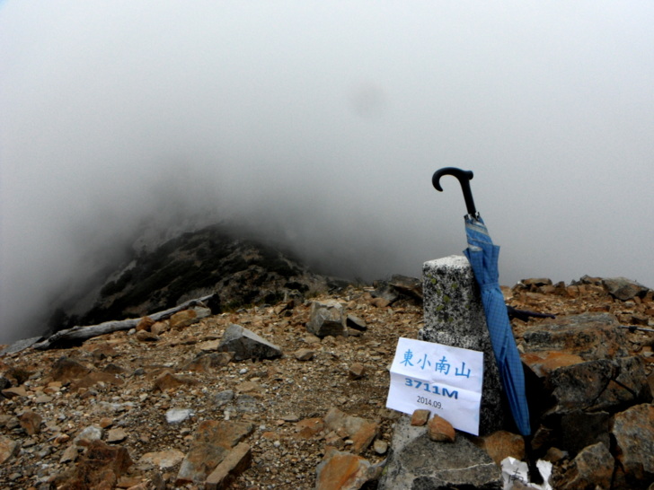 1145登頂東小南山(H3685M,記:3711M)。先拍登頂照,濃霧中無任何展望。小休片刻,本想在這裡用午餐,風勢實在太大,簡單補充行動糧。