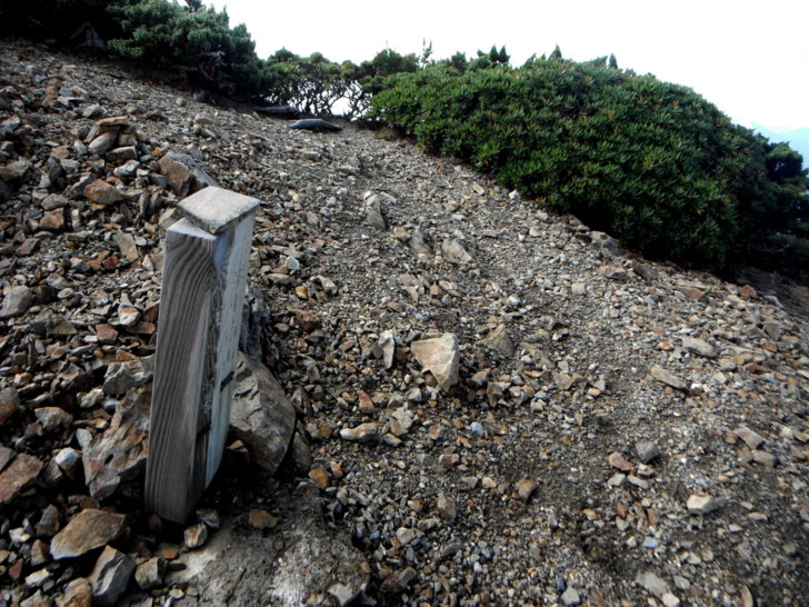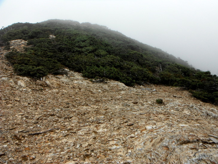 0842南玉山叉路(H3700M)。右往南玉山4.7K,直往東小南1.6K,取直行,一小段木階後,碎石坡陡上。鬆軟的礫碎石,走的有點滑,踩穩每一步後,緩慢上行。
