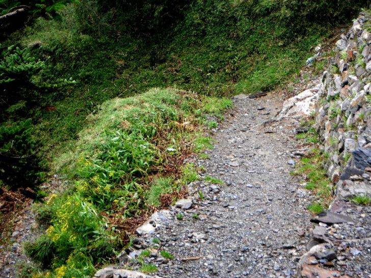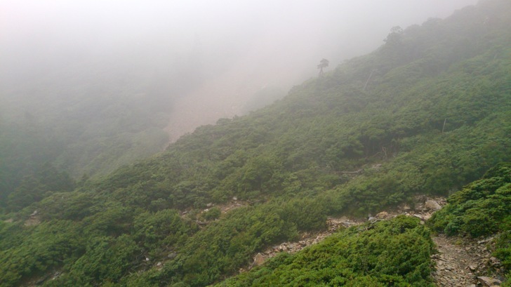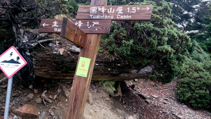 0822路ㄟ啟程撤退,三位山友留在山屋,準備看天候狀態再決定。雖然重裝上肩,山屋外被強風吹襲,仍舊無法站穩腳步,偶爾隨強風飄下來的雨勢一陣一陣的,阻礙了行進的速度,循反光柱上行。