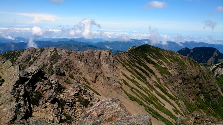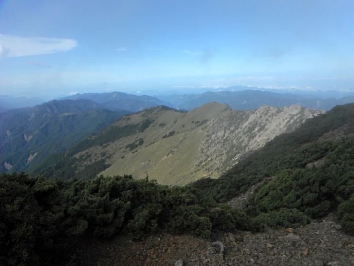 整個玉山稜脈,在此一分為二,行成特殊優美的閉鎖曲線,順稜蜿蜒,如游龍擺尾,難怪有"天龍峰"的稱號;遠處中央山脈群峰在此感覺似遠又近,峰峰相連,層層堆疊,瞬間又殺了不少記憶空間。一路上來,總算沒有白費苦心。