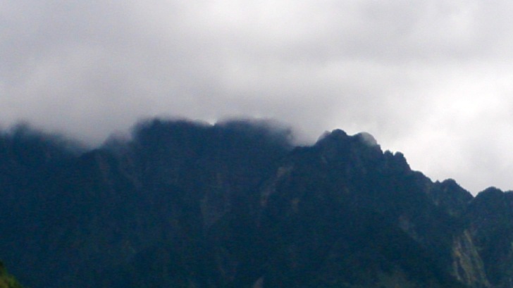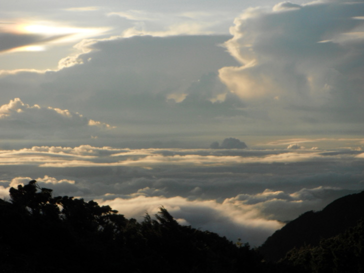 再度醒來已過五點。強風未歇,走出山屋外,雨已停,滿山濃霧,遠望塔塔加登山口,看似晴天,形成一種特別的天氣景觀。強勁的風勢有刮颱風的感覺,天空仍舊昏暗。在山屋內煮食早餐,與友人討論後,決定取消行程,雖然明天還有一天,不過已經沒有多大意義,還是決定撤退。此時,三位紮營的年輕帥哥進入山屋,看樣子昨晚的風雨讓他們有吃到一點苦頭,路ㄟ表明要撤退,可以將床位讓給他們使用,閒聊一陣子,兩位山友看雨勢已停歇,還是準備走訪南玉山,另一位山友昨晚沒睡好,要留下補眠。兩位山友屋出發後,山屋裡就路ㄟ等三人邊燒水邊收裝備邊聊天。沒有多久,出發的兩位山友折返,因位在南玉山叉路的碎石坡風勢太大,強行通過有被強風吹落斷崖的危險,所以只好撤退。