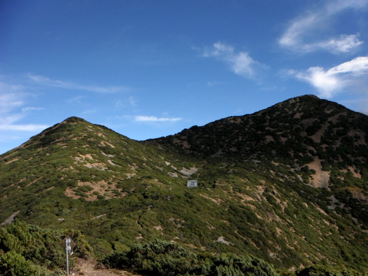 1032過西峰下山屋。豔陽高照,卻也強風陣陣,一個不留神,路ㄟ的帽子被強風吹落山谷,只好下山後再買了!續行,開始遇見上山的隊伍,但願他們有好天氣,可以登上台灣的最高峰。途中,巧遇山友元植,一位年輕的登山好手,也是歐都納培植的8000公尺高山的成員之一,他這趟帶隊上主峰,停下閒聊片刻後,互道珍重。