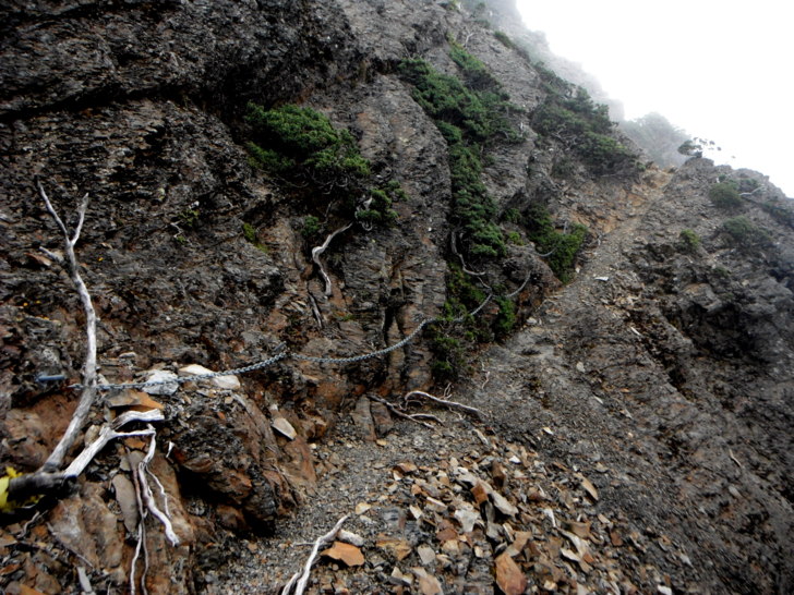0850拉鐵鍊(H3735M)。順三叉峰下腰繞。玉山後四峰少有鐵鍊與繩索確保,這段路該是有其必要性吧!多了這個裝置,走來安全無虞,只是,路徑仍舊不好走。