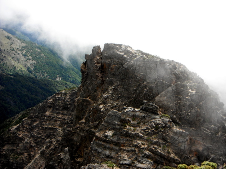 1048剛剛好30分鐘!雲層已籠罩整個山頭,風勢急摧,只好啟程下山。取原路下行。陡峭的山勢,上來不易,下去難。還是手腳並用緩下。