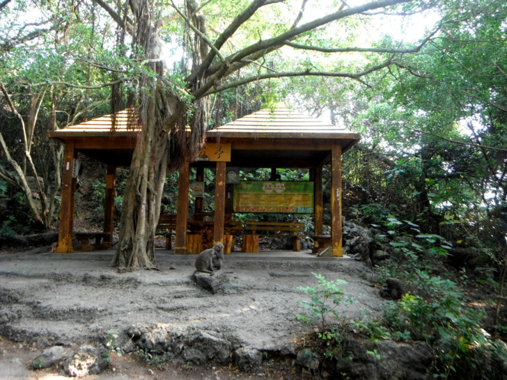 0852抵良友亭。整群獼猴家族悠閒在路邊,對路過民眾視若無睹,在這裡曾發生過獼猴搶食傷人事件。近幾年台灣生態環保概念有很大的進展,獼猴數量也成倍數成長,只是,輕易餵食反而降低了野生動物求生的本能,這是國人需要加強的共識。取左階梯上行。