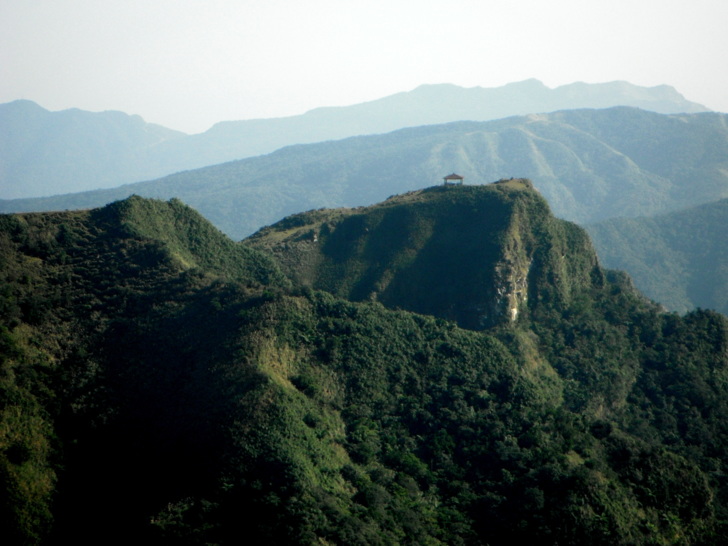 0855抵1K涼亭(H565M)。這裡的風光毫不遜於前面平台。也是欣賞灣坑頭山景色最美的地方。這座熱門的小百岳,從這裡看竟像極了蔣先生的頭,或許改名"中正山"或"介石山"會更貼切一點吧!