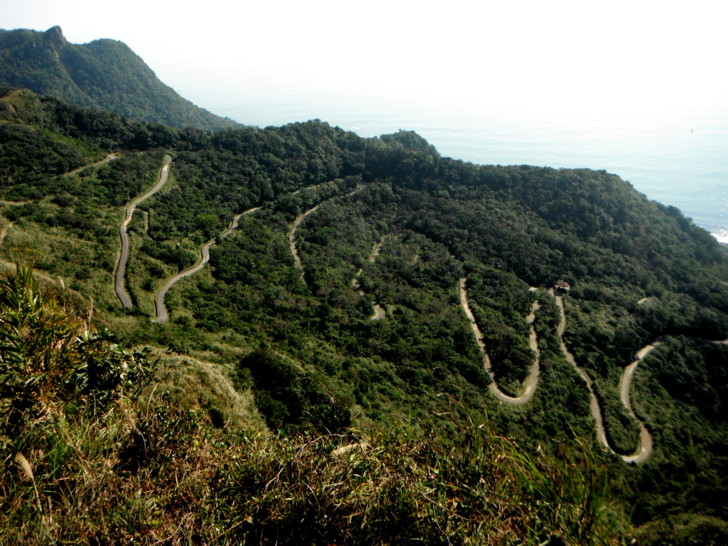 1019回抵"山"字基點。遠處已有一群山友正慢慢上行,錯身交會時,互道加油與問候,雖是非假日,來訪山友還是不少。涼亭處看著蜿蜒曲折的道路,比起九份的愛情公路與太平三十六彎,絕對可以分庭抗禮。