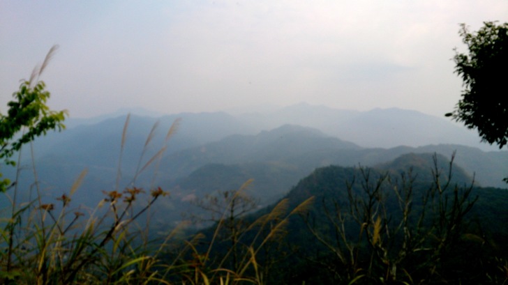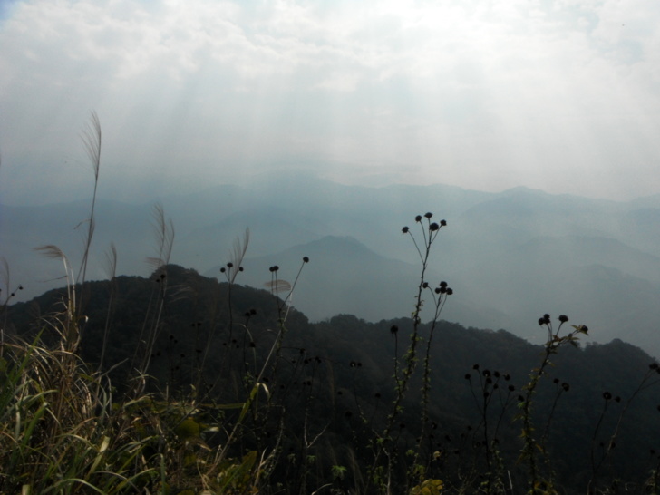 群峰堆疊起伏,伴著淡淡晨嵐,景色頗為幽靜,遠處聖稜卻是大半躲在雲層中,路ㄟ駐足等待雲開,也享受清風。在等待中,山友路續登臨,一時之間,整個基點空地人滿為患。