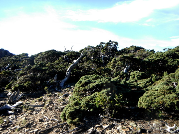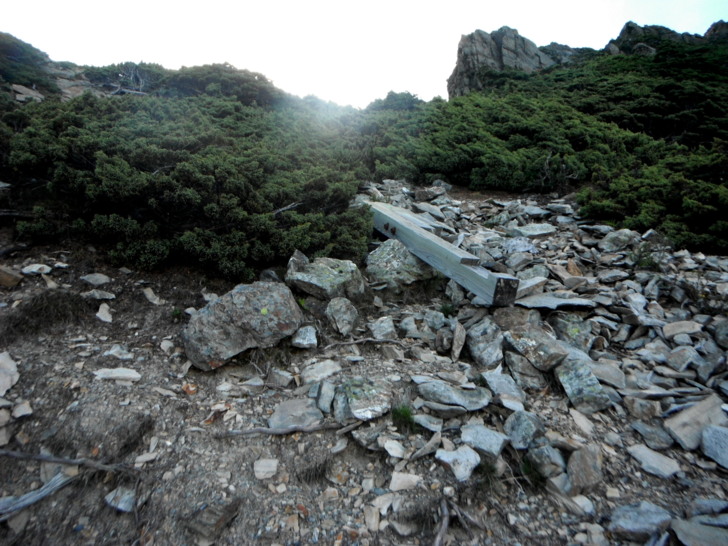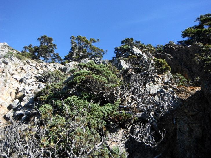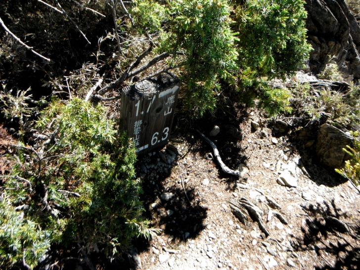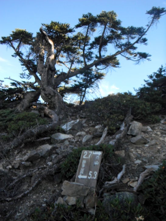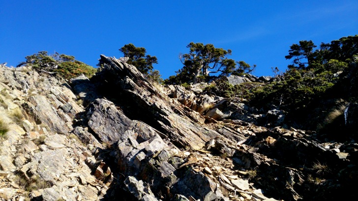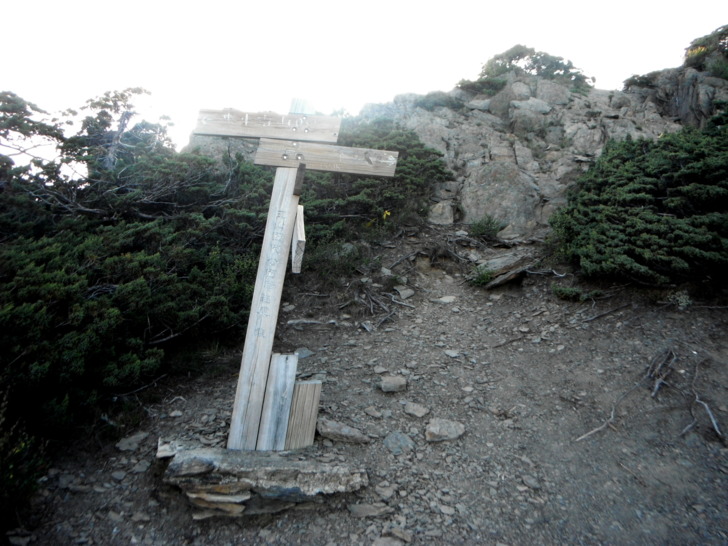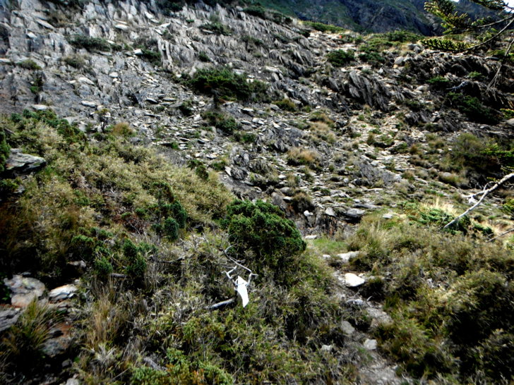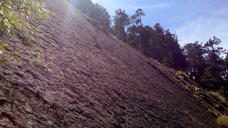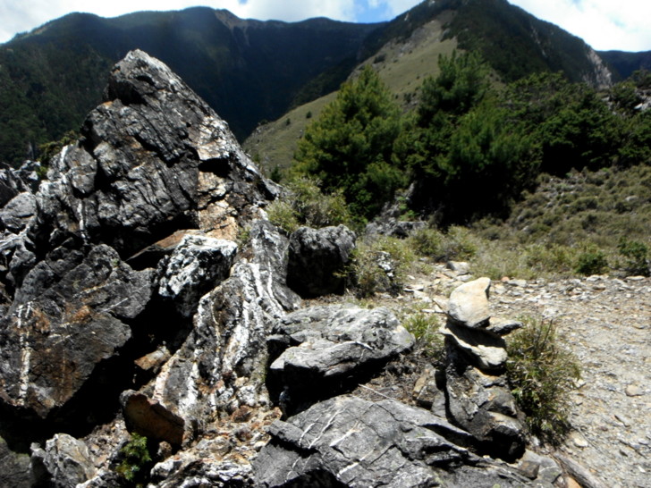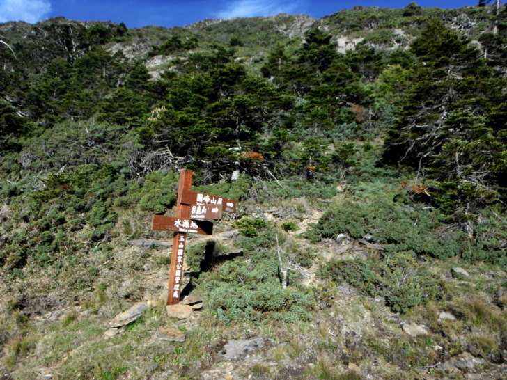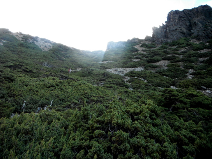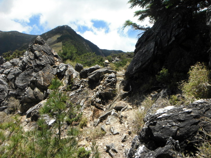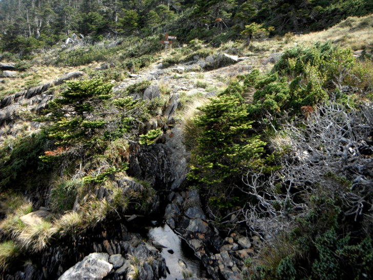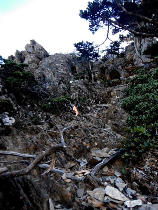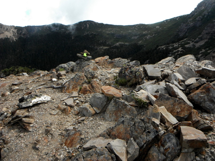 1625牛飲一番後啟程。循指標往南峰行,小穿越樹林後,開始碎石坡陡上。隊友經過充足的休息與水源補充後,體力回復神速,行動速度變快,反倒是路ㄟ忽然覺得腳很重,提不上速度,遠遠落在隊友後面。