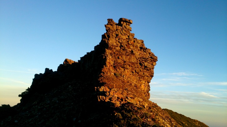 鐵鍊上到三叉峰登山口附近,已見曙光露臉,停下腳步欣賞日出,隨著晨曦的展現,整個三叉峰映成一片金色山頭,耀眼奪目。欣賞完日出,續行腰繞三叉峰。南峰頂上的四位山友還在峰頂流漣,良好的天氣,在山頂是一定有美景可賞的。