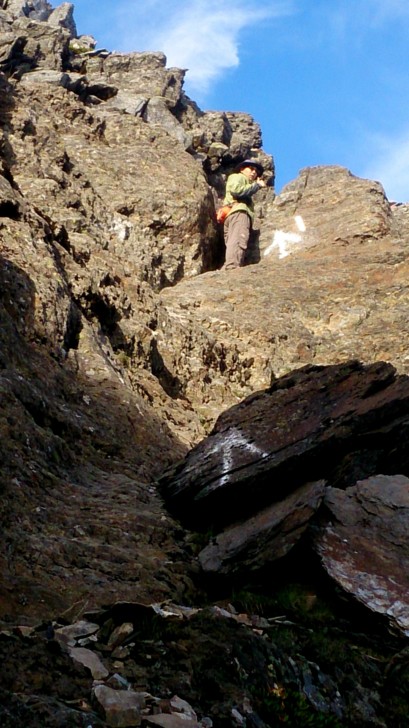 1710回四叉路口(H3795M)。隊友已等候多時。看他精神不錯,其實是路ㄟ最放心的。順指標往南峰前進,路不長,卻是刺激的徒手攀岩,順著白色噴漆陡上。