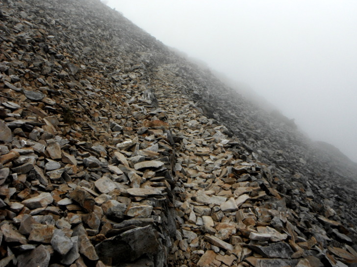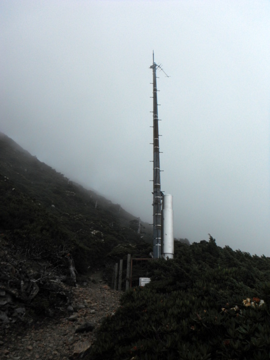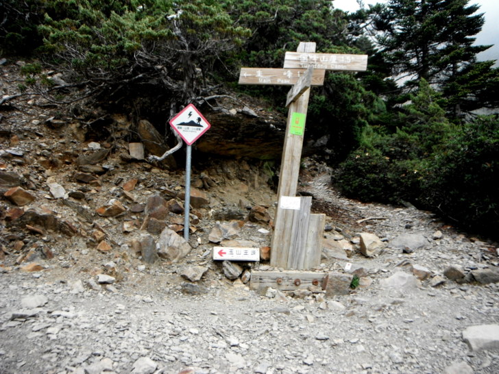 1312主、南叉路口(H3510M)。左往玉山主峰1.7K,右往圓峰山屋1.5K,取右行,進入長緩坡。今天雲霧起的頗早,壯觀的玉山主峰躲在霧中,看不到美景,夏天山區本就容易有陣雨,路ㄟ雖有些耽心,倒也有心理準備。