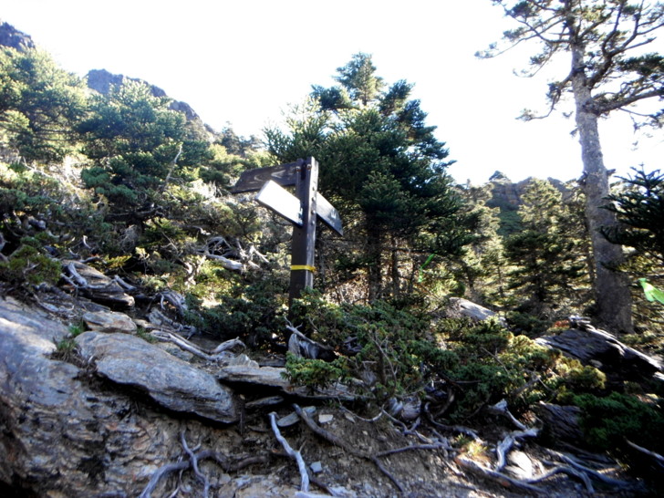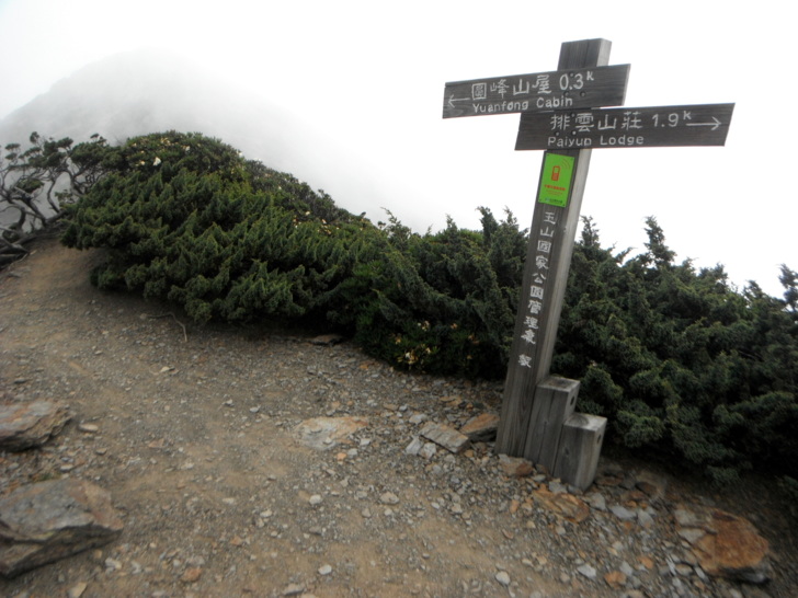 1403圓峰叉路(H3690M),此行的最高點。也是從南稜登玉山主峰的起點。循防迷標竿下行,圓峰山屋就在山谷中,清楚可見。