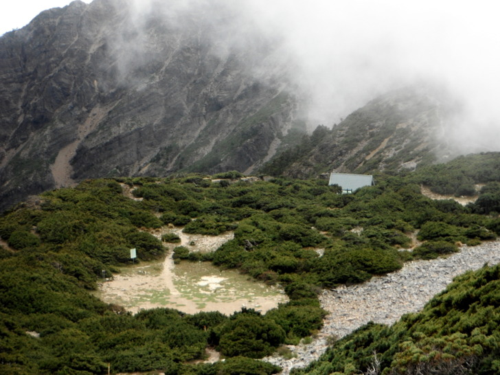 0920西峰下山屋(H3020M),下揹包小休。在這裡遇到兩位巡山志工,他們正要結束任務下山。閒聊中,知道圓峰除了一個七人小隊,已沒有山友上山,路ㄟ一行兩人算是最早的,接下來幾天也不會有志工上山,他們建議路ㄟ把帳篷藏起來,最少山屋有公務床位可以睡,建議路ㄟ先上山屋用公務床位。能少揹2、3公斤的帳簿,自然是好事,當下接受志工的建議,把帳篷卸下,藏在附近隱密處。