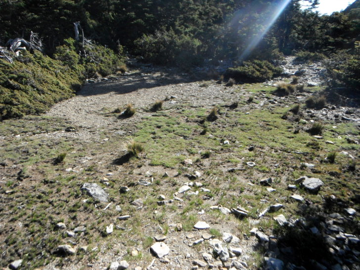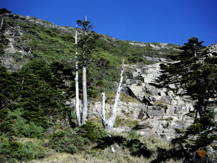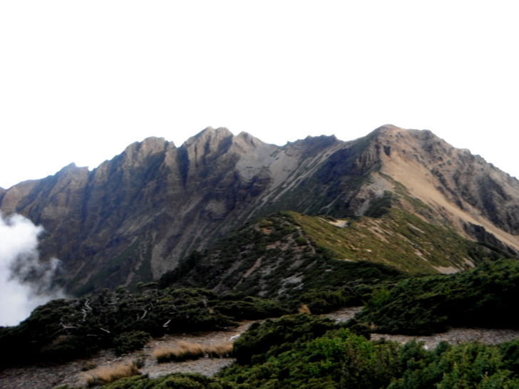 0729大營地(H3625M),平坦寬廣的營地,離水源不遠,老實說,是一塊頗優良的營地。只是要從塔塔加揹到這裡可不是鬧著玩的,況且回程還要陡上繞過三叉峰,所以營地雖美,應該也不會有人想來這裡紮營吧!!續行,路徑轉為碎石與岩坡,路ㄟ知道從這裡開始,要起伏翻越幾座山頭,還會越翻越低,為了保存回程體力,放慢腳程,邊賞景邊休息。