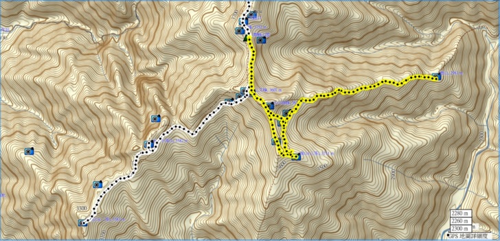 1450隊友抵達。表示已經沒有水了,當下決定回水源地取水。好在從這裡到水源地都是緩坡,還有樹林遮蔽,恰可減少用水量。
