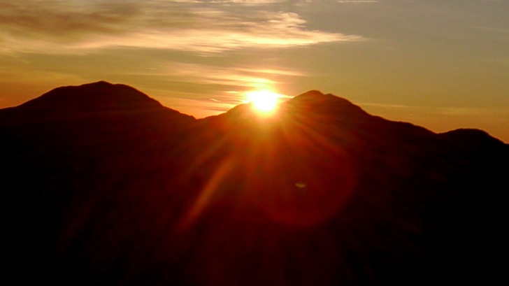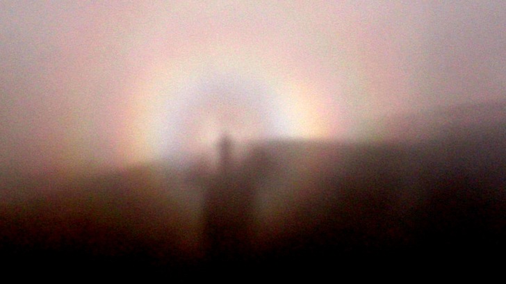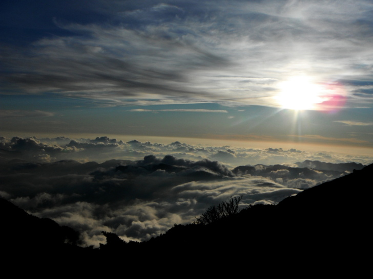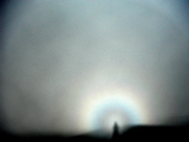 約過30分鐘,帥哥回來在平台上驚呼"看到觀音圈",隊友薯條與留守的女山友都跑去看。路ㄟ等水燒開,走到另一個平台欣賞美麗的觀音圈美景。賞完觀音圈,回到山屋前閒聊,帥哥明天下山,他準備重裝從南稜登玉山主峰再下山,以他的體耐力,重裝登玉山不難,只是南稜並不好走,路ㄟ建議他要特別注意瘦稜與風勢,真的風太大就不要冒險從南稜上去。