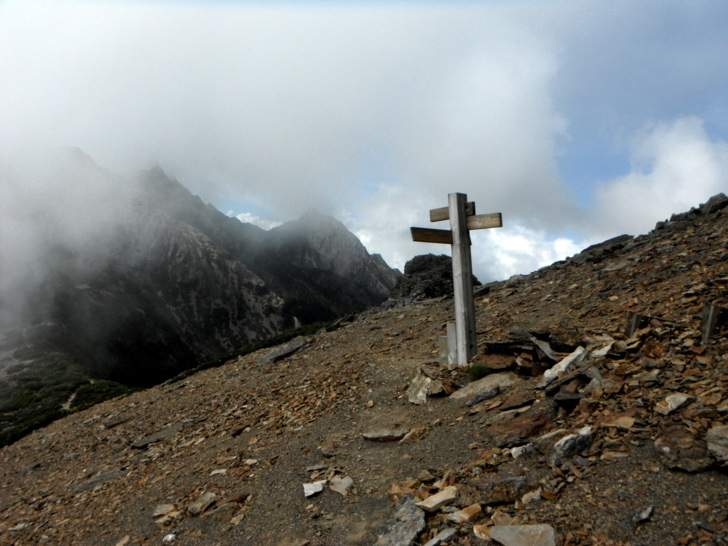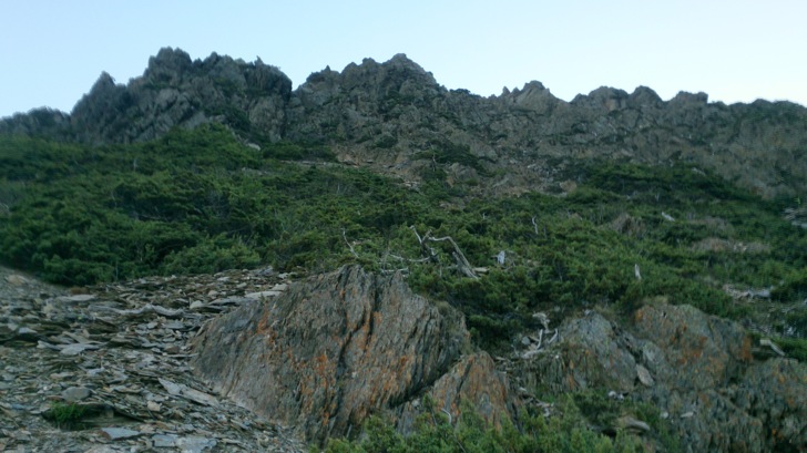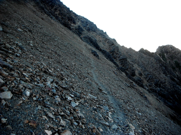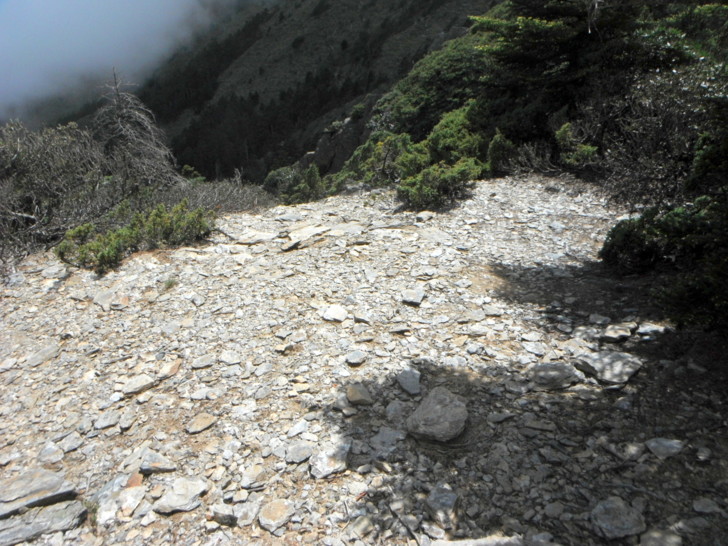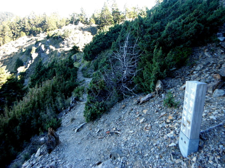 0530南玉山叉路。取右碎石坡行。曝露感頗大,良好的天氣走來安全,去年造訪時,台中的山友因颱風外圍環流影響,碰到強風,在這裡撤退,所以要訪南玉山還是要靠一點天氣與運氣的。