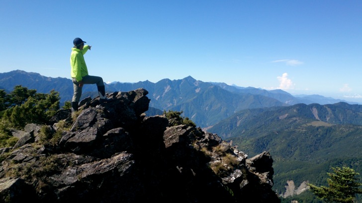不久,隊友薯條抵達,三人互拍登頂照。基點旁的巨岩曝露感頗大,卻是南玉山展望最佳的地方。藍天下,也是拍照留影的絕佳地點,三人輪流玩了開來,是一種快意,對照去年來到這裡被雨淋,這趟再訪,總算不虛此行了!