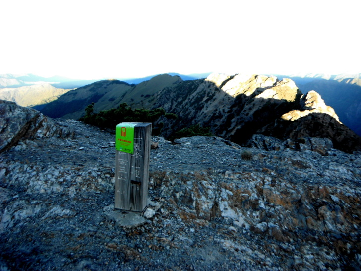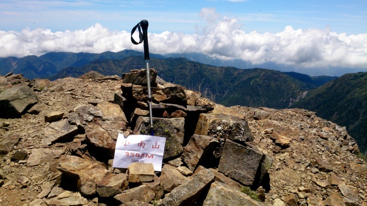 1156登頂小南山(H3600M,記:3583M)。帥哥將高度牌壓在石頭下,留給路ㄟ拍登頂照。無敵的展望,優美的山色,是路ㄟ上一趟沒看到的風光。展望比南玉山好上數倍,雖然這不是百岳,不過路行者感覺登小南山比造訪南玉山更值得,又是一陣秒殺。