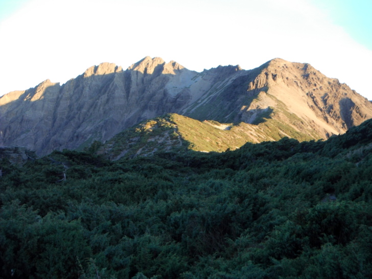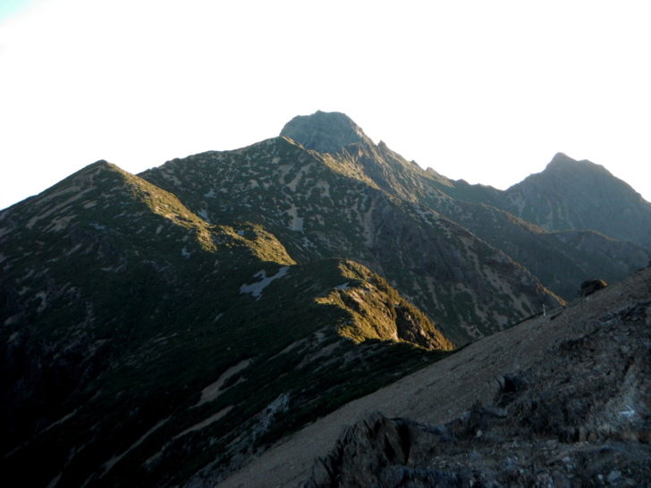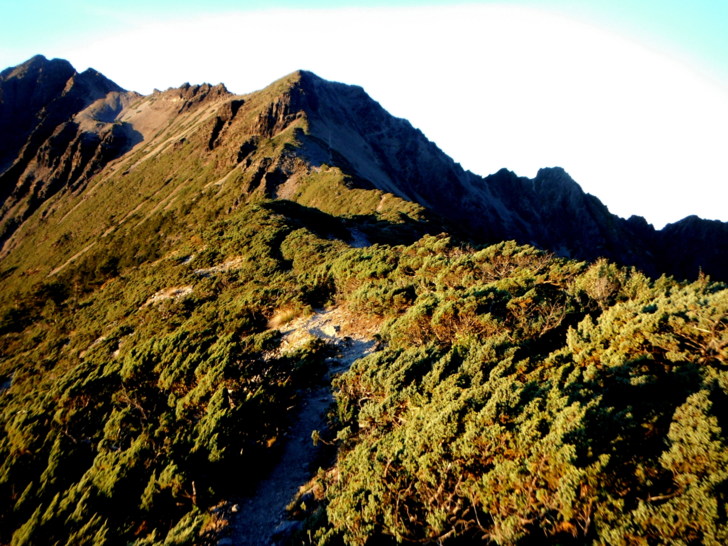 0510圓峰山屋啟程出發。踩著晨光,不用頭燈,循南峰方向前進,昨天走過的路徑,今天再走自然熟悉很多,良好的天氣,玉山風光仍舊優美,走來還算輕鬆。