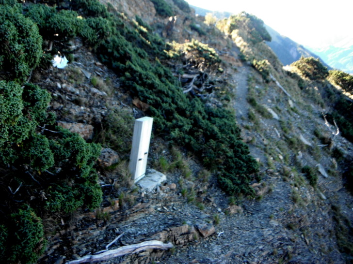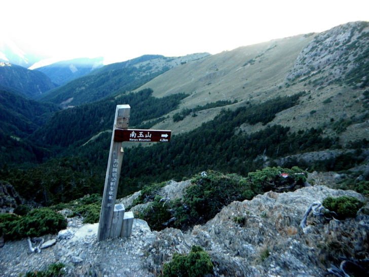 0600抵4.2K指標牌(H3655M)。停下來脫衣服,重新整理裝備後,順指標進入第二階段的橫渡與陡下。玉山後四峰少有架繩,嚴格說起來,走來並不安全,所以才有"老手的渡假,新手的進階"的說法,只是路ㄟ不是老手,也稱不上新手,只算是小心慢行順便賞景的摸魚手吧!