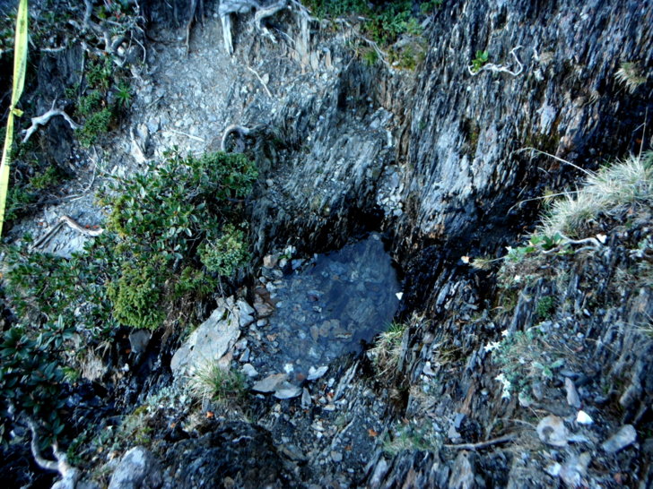 1415途中小營地(H3610M)。小休片刻。這塊平坦空地是紮營的好地方,離第一水源地也近,取水頗為方便,只是...應該不會有山友重裝下到這裡紮營吧!畢竟從這裡回圓峰要比昨天往鹿山途中的營地要難上許多。補充水與行動糧。看著高聳的來時路,隊友正緩慢的上升中,實在很懷疑早上是怎麼下來的?
