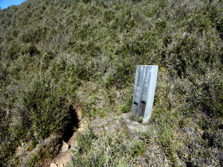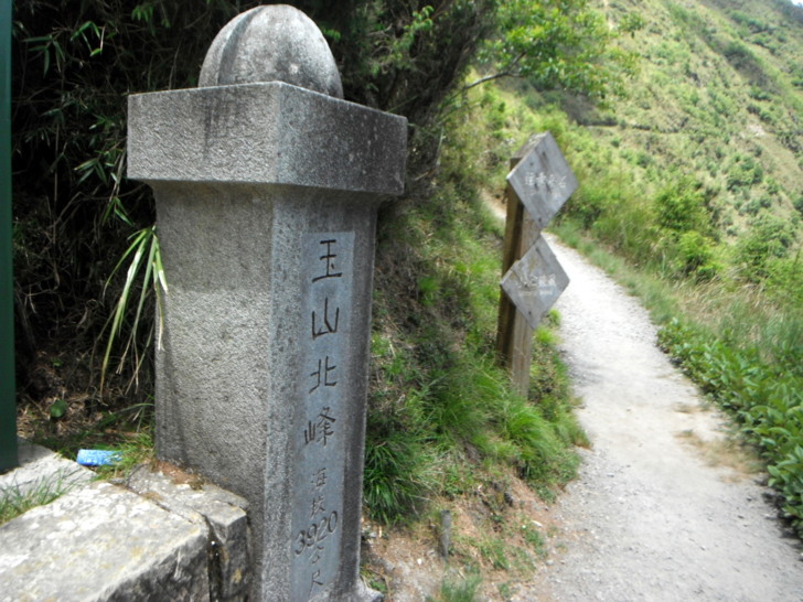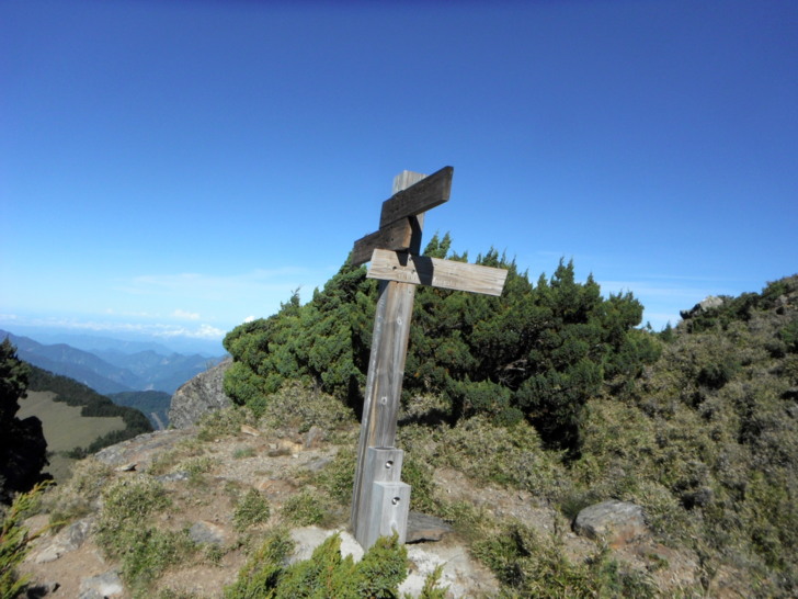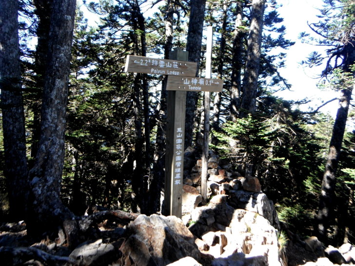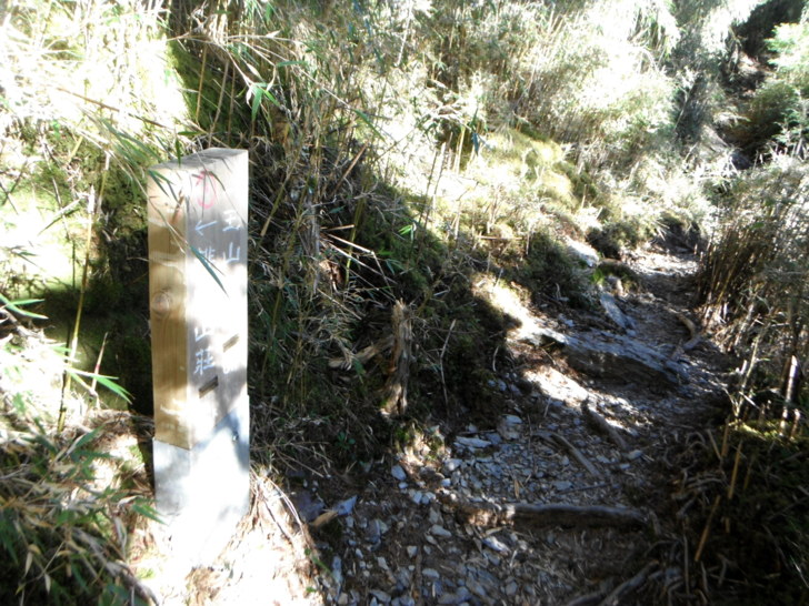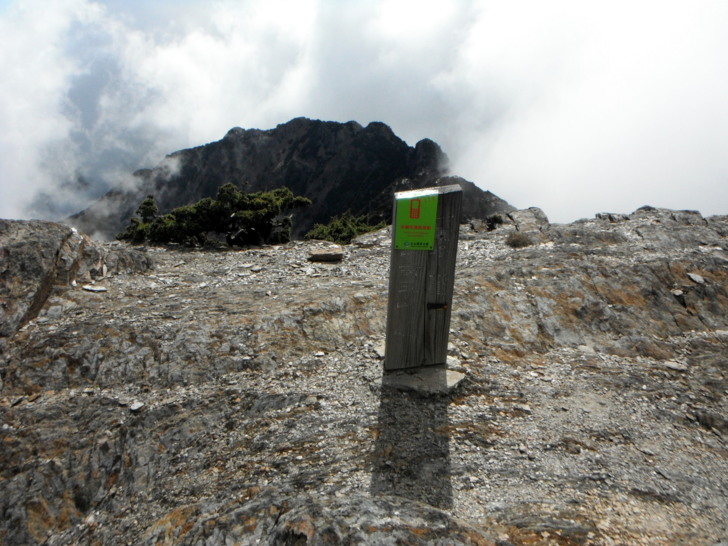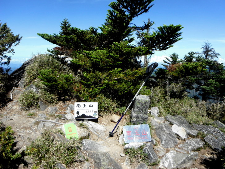 0855登頂南玉山(H3410M,記:3383M)。走到基點,竟沒看到帥哥,走到基點旁的巨岩上,還是沒看到人,路ㄟ一陣狐疑,先找林蔭處下揹包,才看到帥哥從過頭了的山徑走回來,原來在基點旁的指標牌上標0.01K箭頭往左(很容易誤以為是0.1K),他以為還要走100公尺,走了一段路發現越走越低好像不對,才又折返。其實基點就在指標牌正上方,被岩石與矮樹擋住了,路ㄟ第一次造訪時,也跟帥哥一樣,往左走了一小段才折返,真的建議玉管處把指標箭頭改一下向。