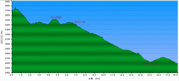 3.玉山西峰由排雲至西峰,全程約4.5KM,高程上升約200M,大抵2~3小時(含休)能完登全程,山徑單純、清楚,無迷路之虞。唯,過1.7K後,小段曝露感頗大的地形,建議小心行走(尤其雨天或雨後)為宜。