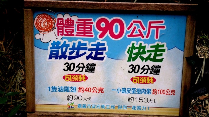 循環湖公路來到好漢坡登山口旁空地停車,一瓶隨身水,取步道上行。步道易行,林蔭濃密走來悠閒,路旁不時有熱量消耗牌,生動易懂。