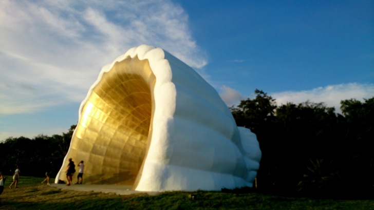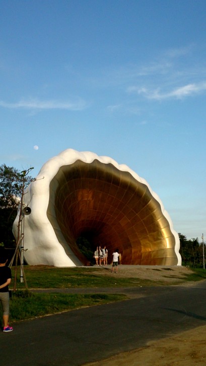 夕陽下的金色貝殼,在光線的折射下,更顯光彩奪目,也是旗津目前最多人駐足留影的地方。